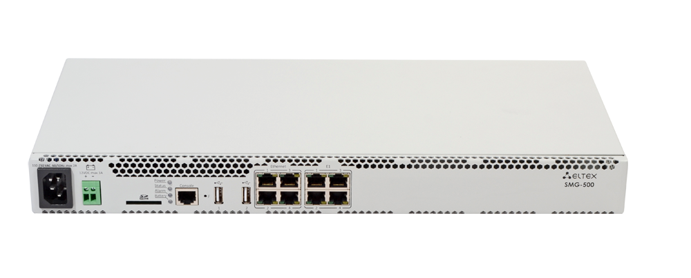 SMG-500 – офисная АТС на 500 абонентов с полным набором дополнительных абонентских сервисов (ДВО). Офисная IP АТС SMG-500 рассчитана на 250 SIP-абонентов в базовой конфигурации с возможностью расширения до 500 абонентов при приобретении соответствующего ПО1. Для подключения к ТфОП могут использоваться порты Е1 и SIP-транки. Аналоговые телефоны подключаются к SMG-500 через абонентские VoIP-шлюзы, IP-телефоны – напрямую через сеть передачи данных. Записи разговоров и CDR-файлы хранятся на SD-карте либо USB-накопителе. Также предусмотрена возможность автоматической выгрузки файлов на внешний носитель и на FTP-сервер.