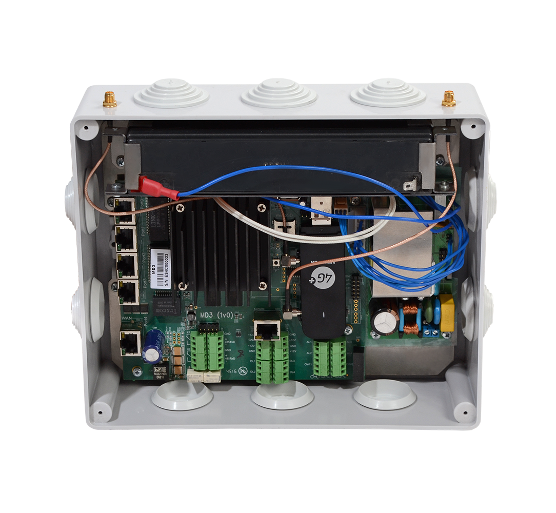 Промышленный контроллер MD3 предназначен для создания системы мониторинга объектов, сбора технологической информации и передачи ее во внешнюю платформу управления и мониторинга. Устройство обеспечивает контроль и сбор информации с датчиков и оборудования, установленного на объекте мониторинга, через сухие контакты, интерфейс RS-485, Ethernet, 1-wire с возможностью сохранения информации на SD-карте: подключение датчиков движения, открытия/закрытия двери; подключение аналоговых датчиков (охранной, пожарной сигнализации); подключение датчиков температуры; подключение электросчетчиков; подключение IP-камер; подключение стороннего оборудования с возможностью мониторинга его состояния и обеспечения удаленного доступа.